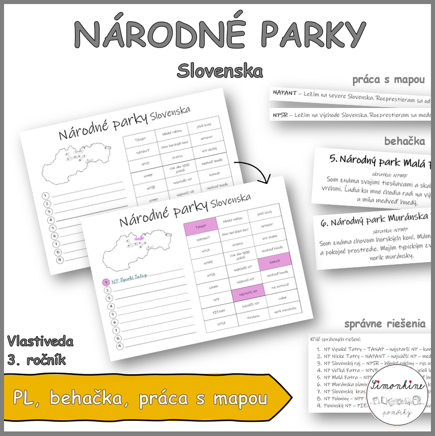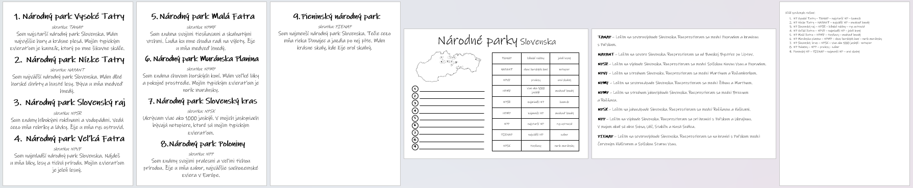 Každé dieťa dostane pracovný list s mapou. Kartičky na ktorých sú popisy parkov rozmiestnite voľne po triede. Úlohou detí je nájsť všetky parky. V pracovnom liste si zapíšu ich názov a farbičkou vyznačia poradové číslo, vyfarbia park na mape a v tabuľke vyfarbia jeho skratku, informáciu o ktorej sa dočítali a zviera, ktoré je pre tento park typické. Máte rýchle deti? Dajte im súradnice parkov, ktoré vyhľadajú na mape. V závere si môžete svoje odpovede skontrolovať na základe kľúča správnych odpovedí.