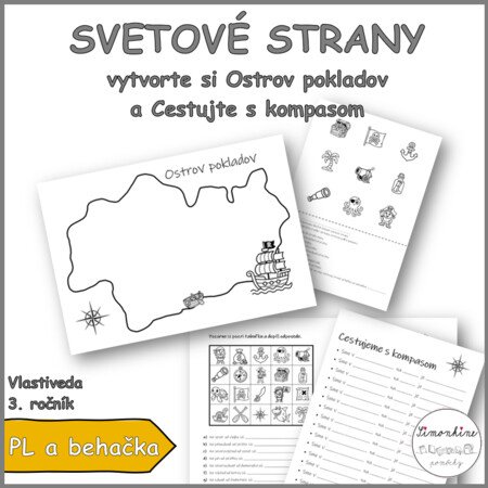 V súbore nájdete ostrov pokladov, pri ktorom pracujete podľa pokynov, ktoré nájdete v inštrukciách. Nájdete tam aj pracovný list, v ktorom budete hľadať kto/čo sa nachádza na danej svetovej strane od určeného obrázka a na záver to najlepšie. K dispozícii máte 3 pracovné listy s predložkami v/na/pri (vyberiete si ten, ktorý potrebujte). Rozmiestnite predmety, obrázky štátov alebo čokoľvek iné po triede/ihrisku, dajte deťom kompasy a nechajte ich cestovať.