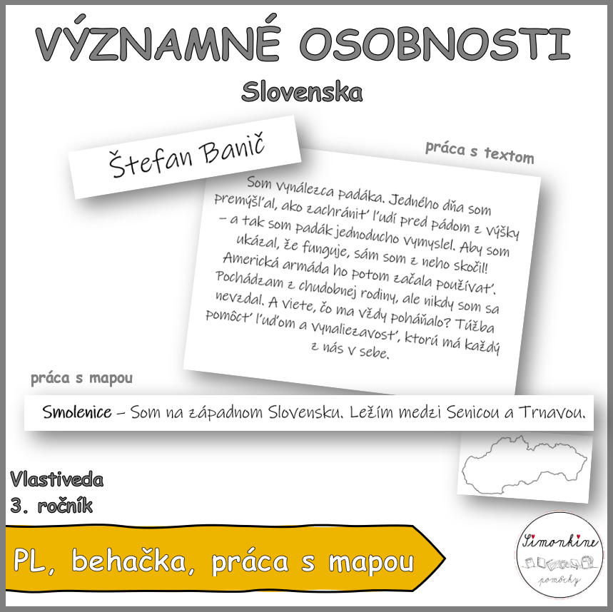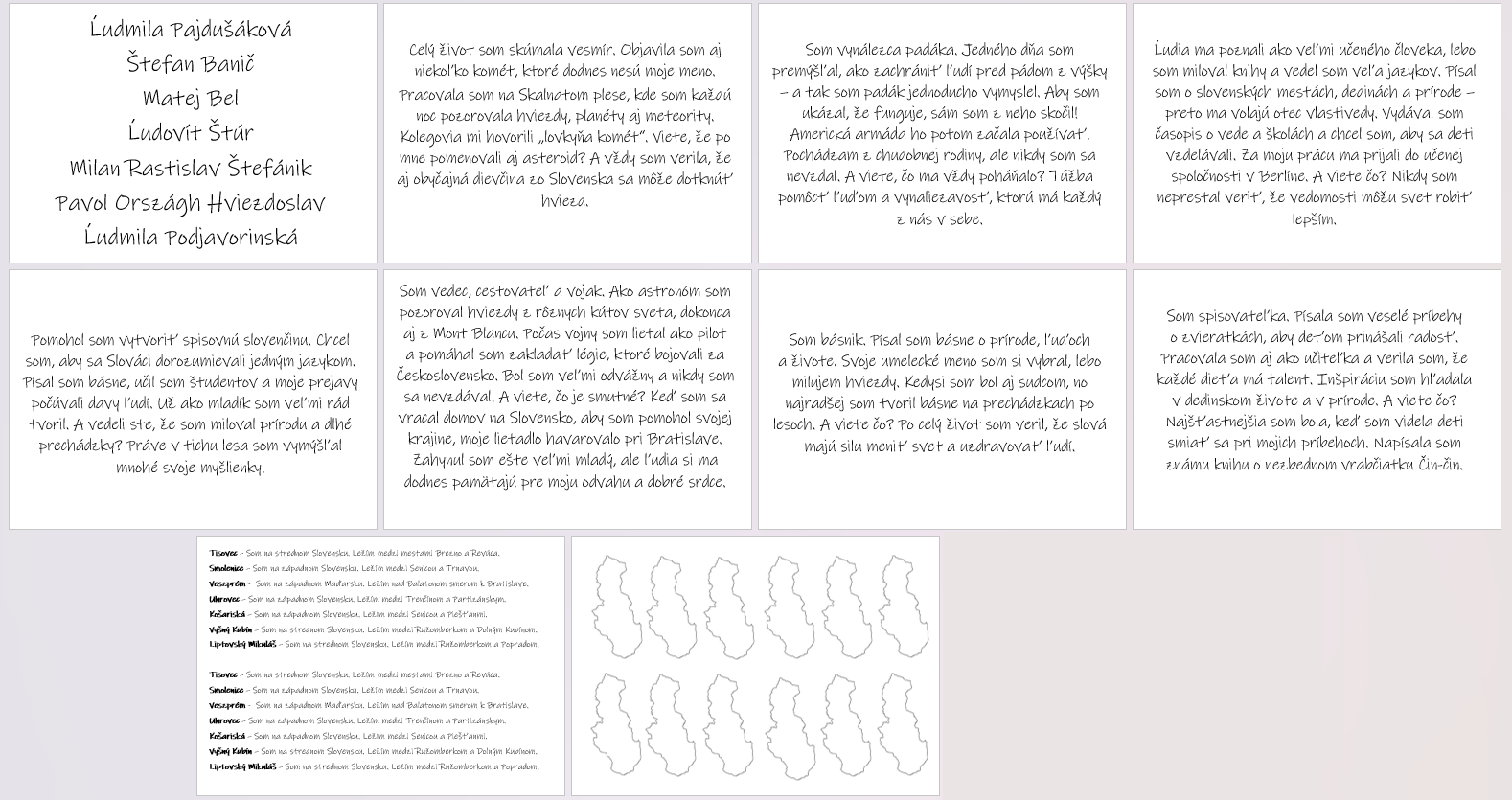 V súbore nájdete stručný popis života: Ľudmila Pajdušáková, Štefan Banič, Matej Bel, Ľudovít Štúr, Milan Rastislav Štefánik, Pavol Országh Hviezdoslav a Ľudmila Podjavorinská. Súčasťou sú aj koordinácie, ktoré deti navigujú pri práci s mapou.