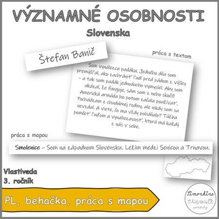 Jednotlivé osobnosti sa Vám samé predstavia. Úlohou detí je priradiť ich opis, k ich menám. Potom nasleduje práca s mapou. Úlohou detí je vyhľadať mesto/dedinu, kde sa daná osobnosť narodila. Nájdenú polohu sme si vyznačili do mapy, ktorá je súčasťou súboru. A čo sme vytvorili my? Každý si vybral jednu osobnosť, ktorú nakreslil a prilepil k nej mapu. K nej sme potom napísali informácie, ktoré sme si zapamätali alebo opäť vyhľadali v texte. Do mapy sme si vyznačili miesto jej/jeho narodenia. A že sme sa toho veľa naučili, a veľa si zapamätali.