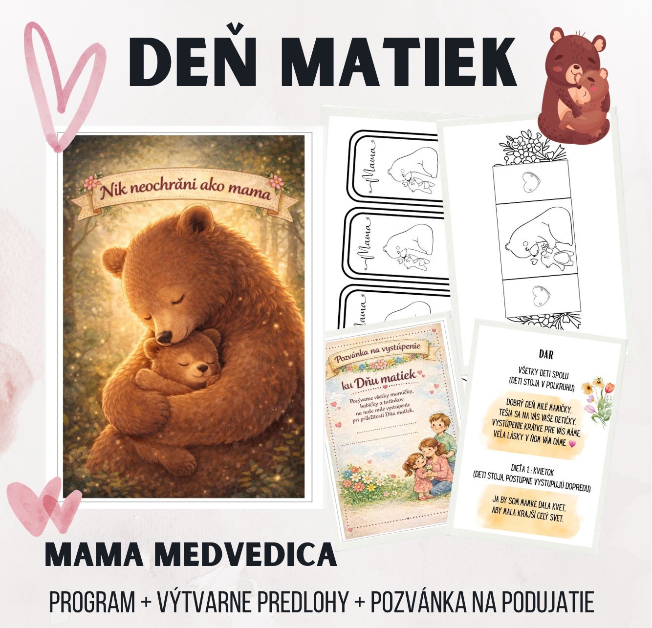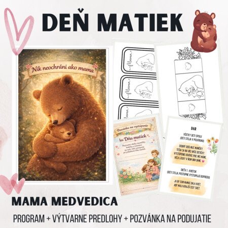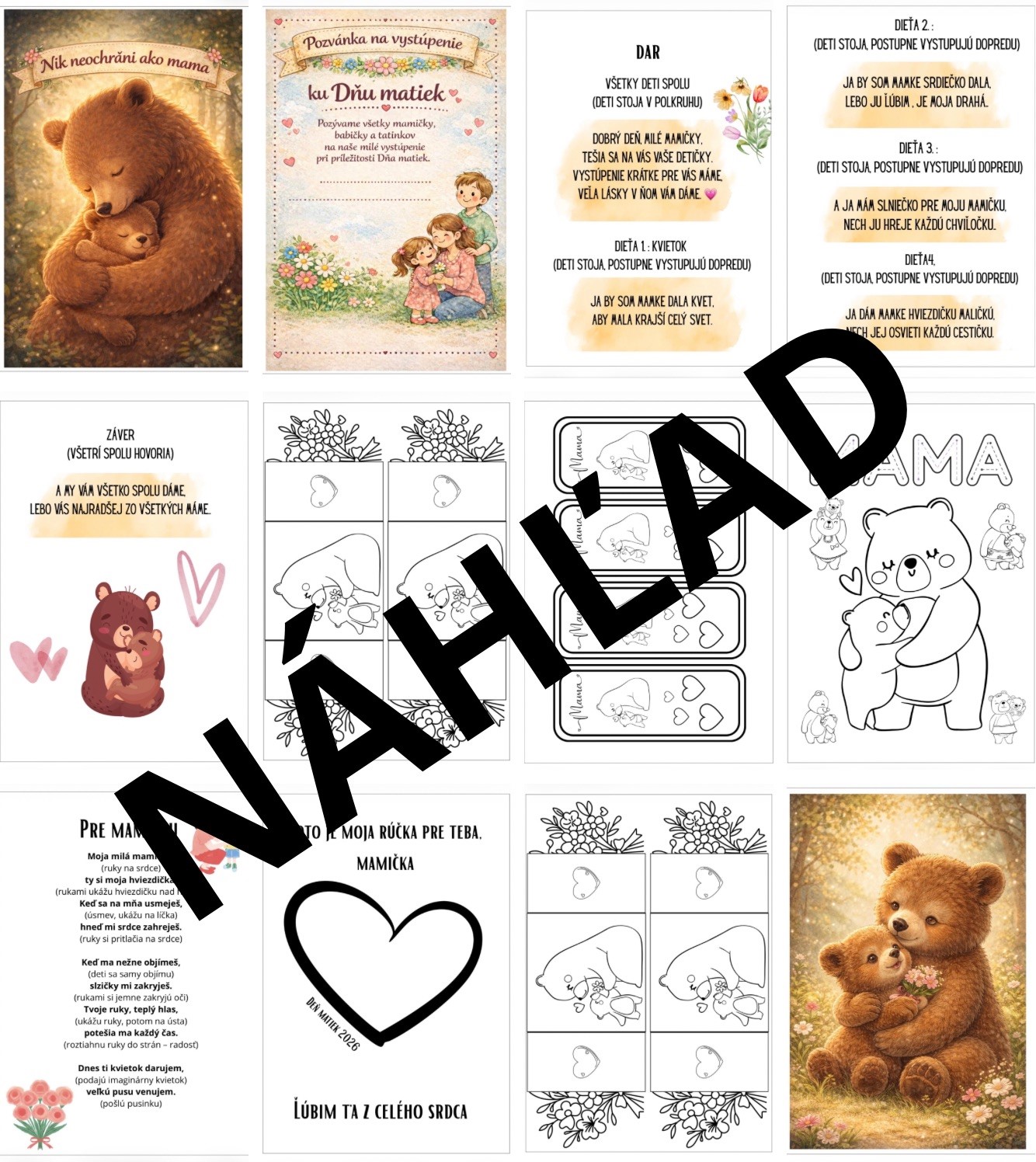V balíčku nájdeš aj pripravenú pozvánku na vystúpenie s miestom na dopísanie termínu, záložky pre mamičku na vyfarbenie, pracovné listy a omaľovánky s jemným motívom mamy a mláďatka, ako aj grafomotorické cvičenie so slovom MAMA. Nechýba ani darčekový list „Toto je moja rúčka pre teba, mamička“, ideálny na odtlačok detskej ruky, a krásne obrázkové plagáty s láskavým motívom medvedice a jej mláďaťa.