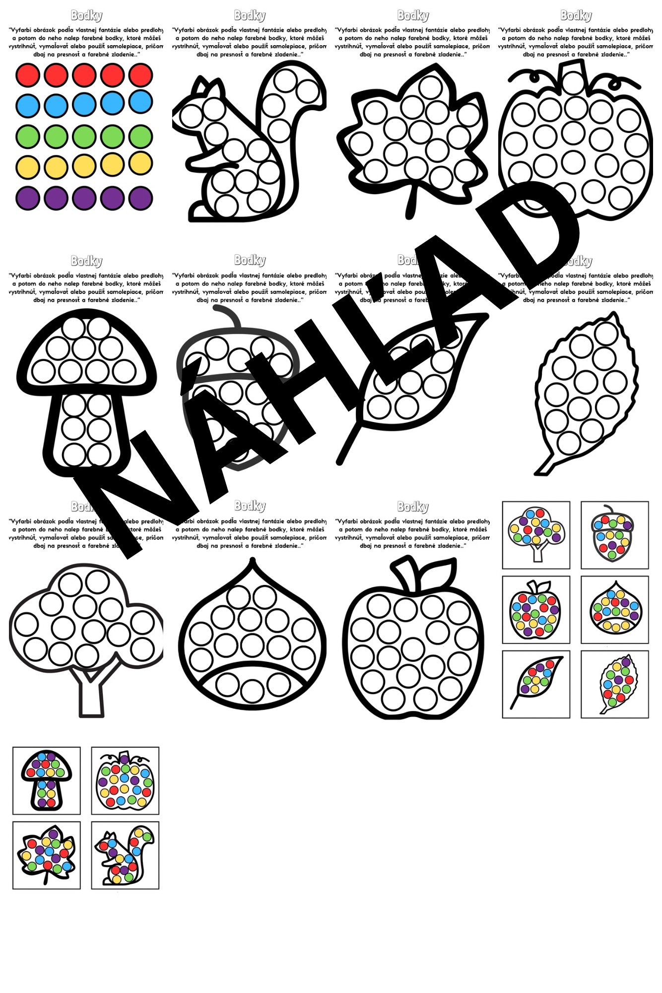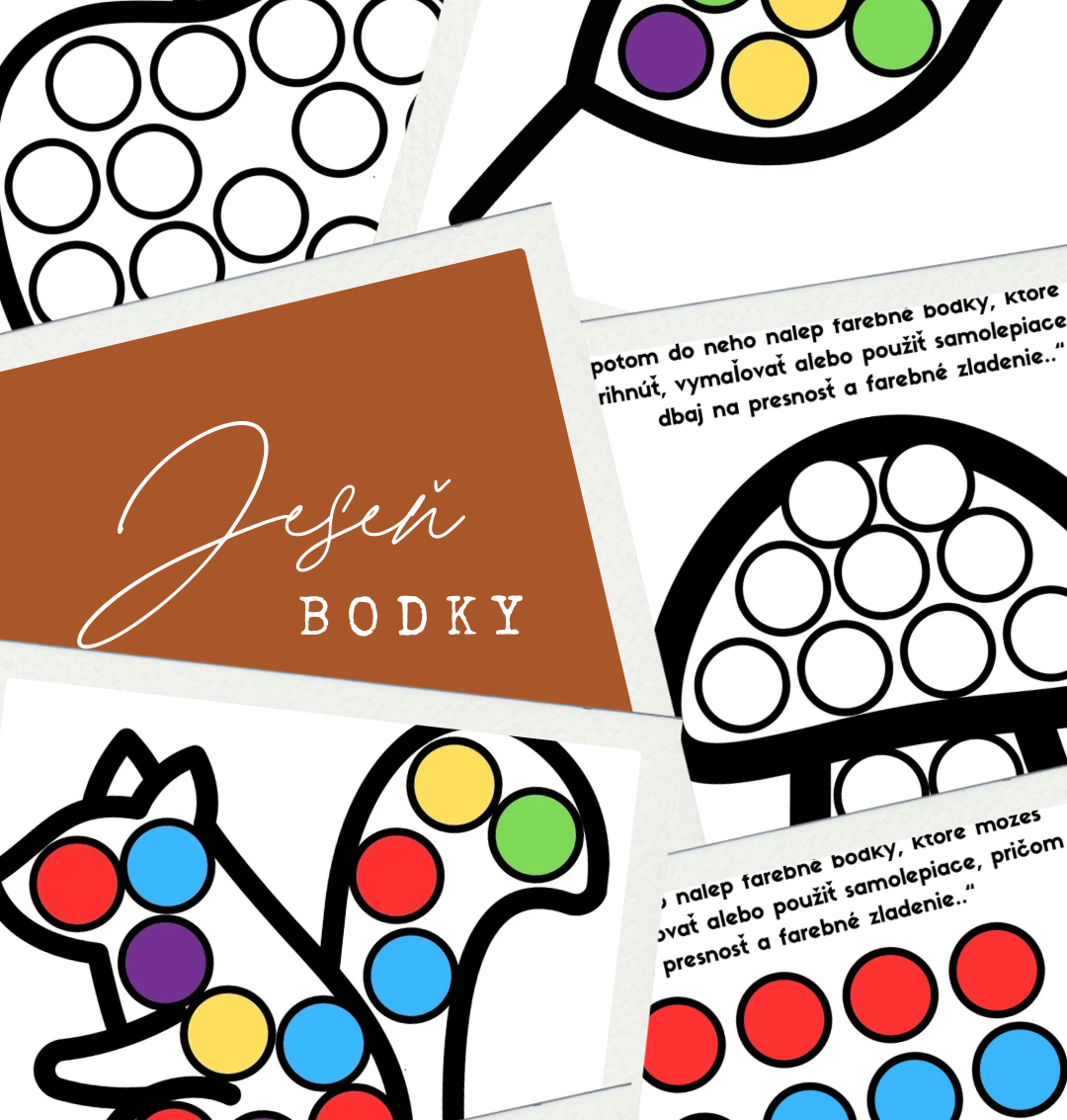 Materiál ponúka rôznorodé možnosti využitia – deti môžu bodky vyfarbovať podľa predlohy, lepiť na ne nálepky, voľne dokresľovať obrázok, vystrihovať bodky z farebného papiera a dopĺňať ich na správne miesto, alebo si obrázky zalaminovať a vytvárať plastelínové guličky, ktoré nalepia na určené bodky. Aktivity sú jednoduché, zábavné a prispôsobiteľné podľa veku a schopností dieťaťa.