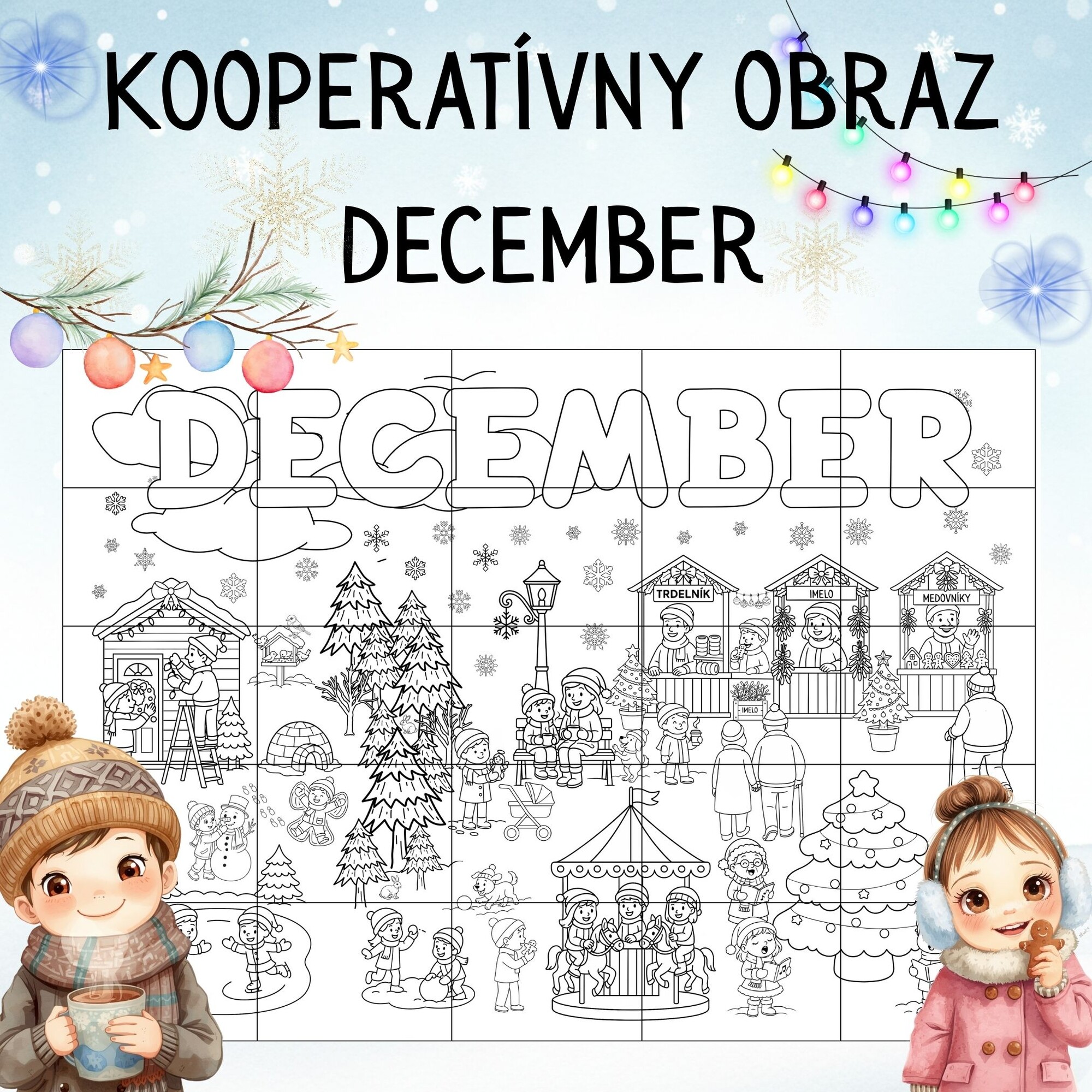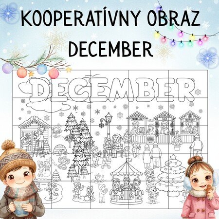 Kooperatívna omaľovánka sa skladá z 25 listov formátu A4. Deti pri jej tvorbe spolupracujú a užijú si zábavu so zimnou tematikou.