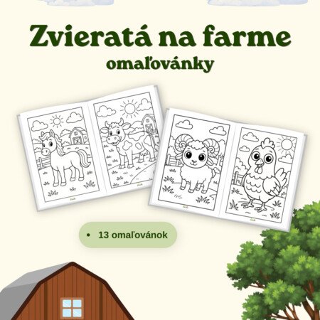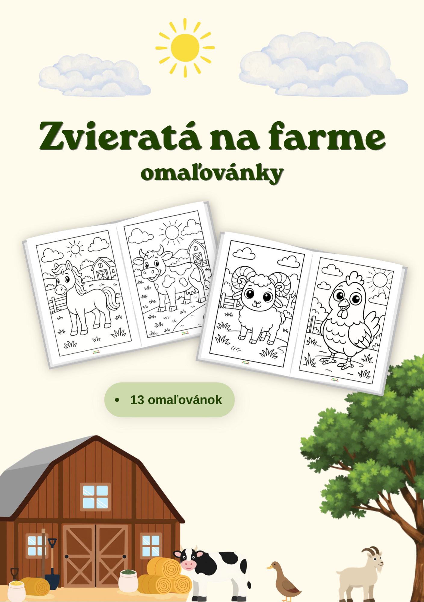 Súbor obsahuje omaľovánky (13) s motívom zvieratiek žijúcich na farme. Ilustrácie sú navrhnuté tak, aby deti nielen zabavili, ale aj rozvíjali ich grafomotoriku a estetické cítenie. Každý list ponúka milý a jasne ohraničený obrázok.