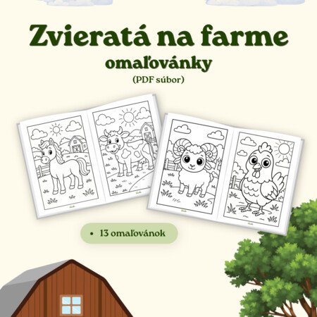 Súbor obsahuje omaľovánky (13) s motívom zvieratiek žijúcich na farme. Ilustrácie sú navrhnuté tak, aby deti nielen zabavili, ale aj rozvíjali ich grafomotoriku a estetické cítenie. Každý list ponúka milý a jasne ohraničený obrázok.