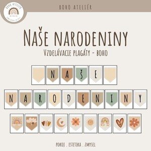 Banner „Naše narodeniny“ v boho štýle je dekoratívny a zároveň edukačný prvok, ktorý v kombinácii s narodeninovníkom