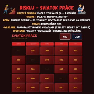 🚩 Riskuj! – Sviatok práce Premeňte hodinu dejepisu alebo občianskej náuky na napínavý súboj vedomostí! Táto digitálna