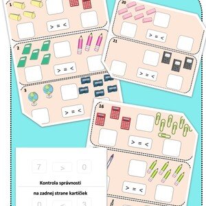 Obrázkové porovnávanie do 10 je súbor 21 kartičiek; žiak na každej kartičke určí počet dvoch skupín predmetov (poznáva
