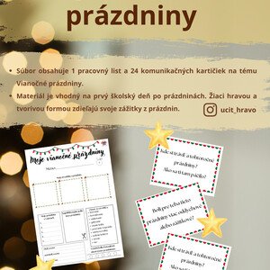 Súbor obsahuje 1 pracovný list a 24 komunikačných kartičiek na tému Vianočné prázdniny. Materiál je vhodný na prvý