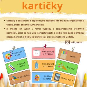 Kartičky s obrázkami a popisom pre každého, kto má rad zorganizovanú triedu ( triedna knižnica, mapy, štetce,..). Súbor