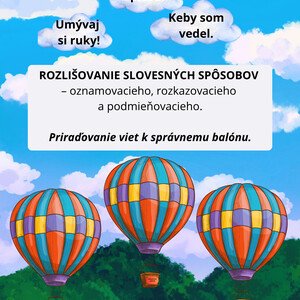48 viet v oblakoch, ktoré žiaci priraďujú k balónom: oznamovací, rozkazovací, podmieňovací spôsob. Ako s materiálom