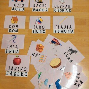 Kartičky na skladanie slov. Kartičky sú tvorené a zoradené podľa písmen základnej abecedy. Úlohou dieťaťa je poskladať