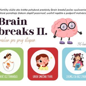 Materiál obsahuje 36 kartičiek brain breaks v Slovenskom jazyku. Kartičky slúžia ako krátke pohybové prestávky (brain
