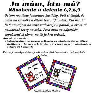 Deťom rozdáme jednotlivé kartičky. Deti si čítajú, čo vidia na kartičke a čítajú text :“Ja mám...Kto má..?”Deti navzájom